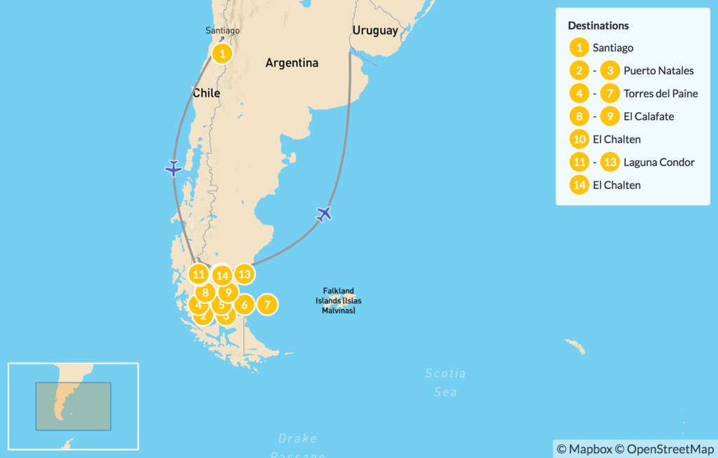 Explore Patagonia’s most breathtaking sites at a relaxed pace while staying in comfortable accommodations on this 15-day itinerary. Kick off in Chile’s capital before continuing south to Torres del Paine National Park for glaciers, turquoise lakes, and thrilling day hikes. Finish across the border in Argentine Patagonia for more glaciers and a secluded mountain lodge with a variety of outdoor activities, not to mention iconic views of Mt. Fitz Roy.