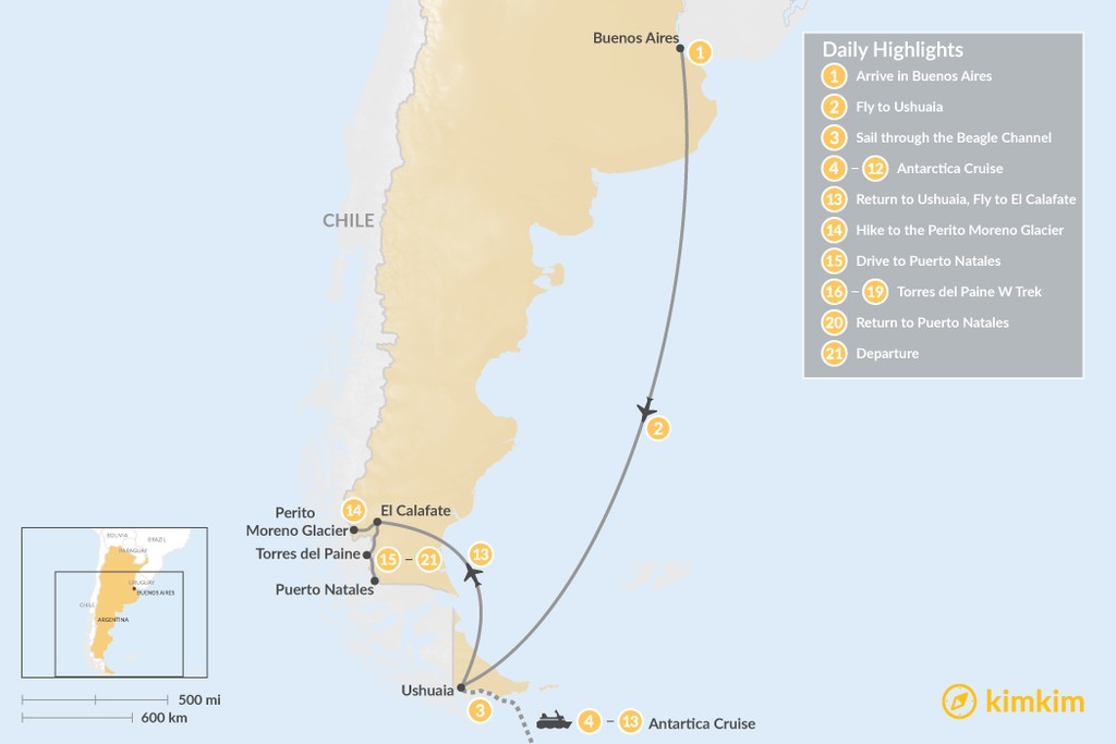 Map of Patagonia Adventure with Classic Antarctic Cruise – 21 Days