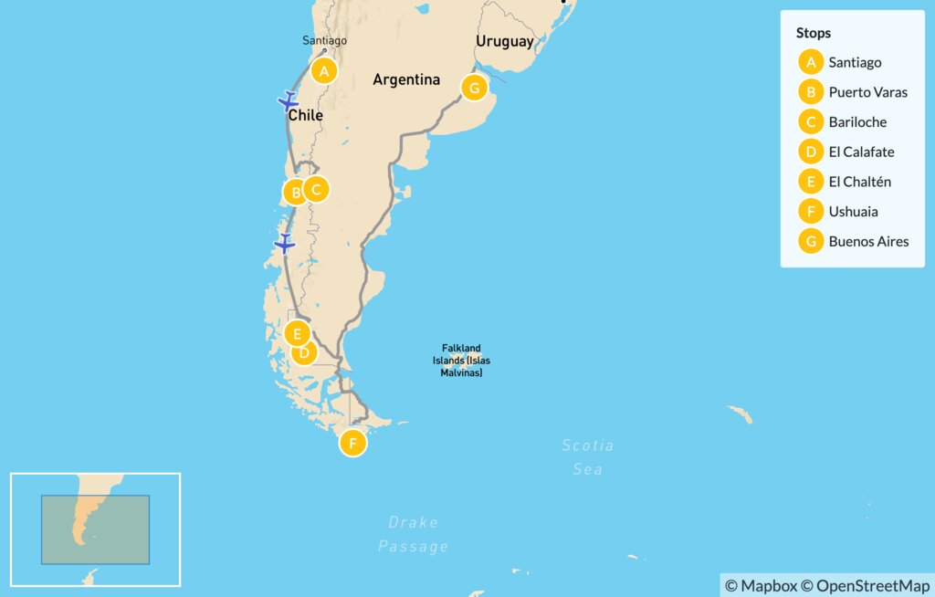 Map of Patagonia Grand Tour: Between Cities, Lakes & Glaciers – 21 Days