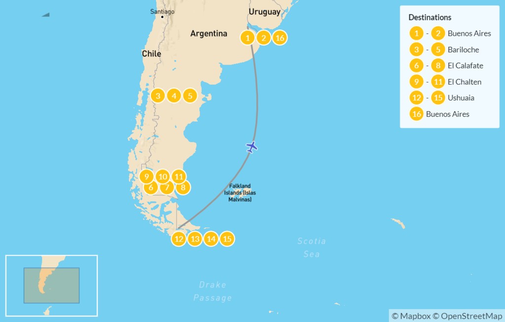 Map of Patagonian Adventures in Argentina: Bariloche, El Calafate, El Chaltén, Ushuaia, & More – 17 Days