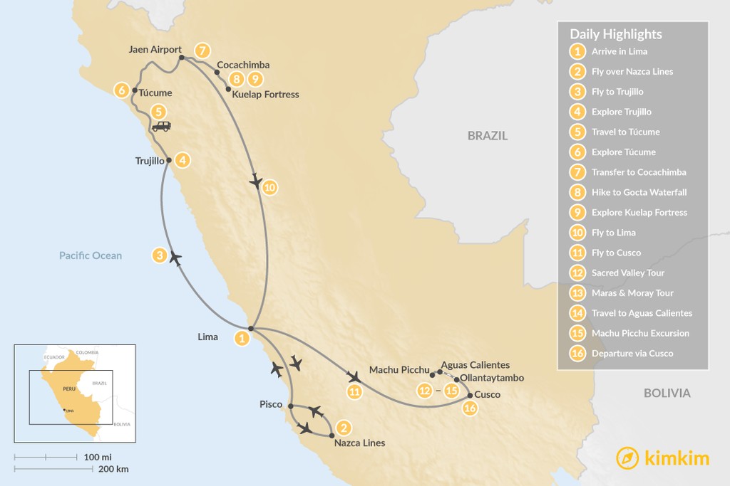 Map of Peru Cultural Tour & Short Inca Trail – 16 Days