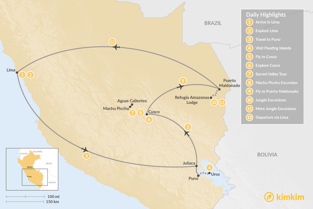 Map of Peru Highlights & Jungle Adventure – 12 Days
