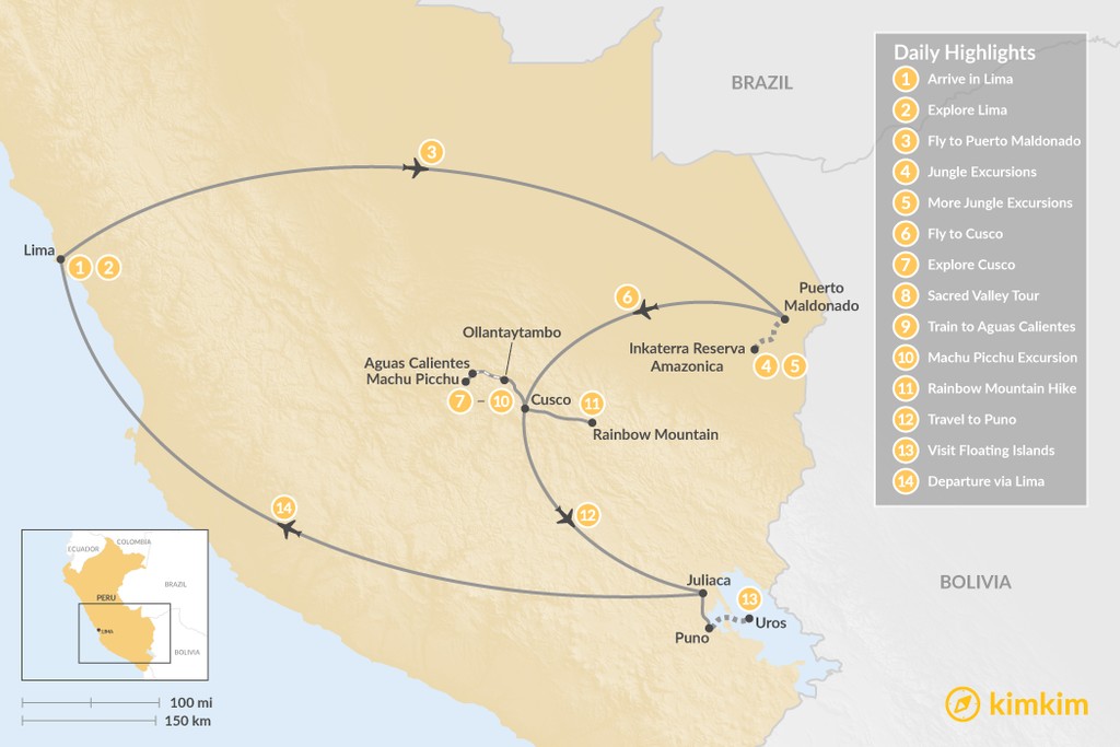 Map of Peru Highlights & Jungle Adventure – 14 Days