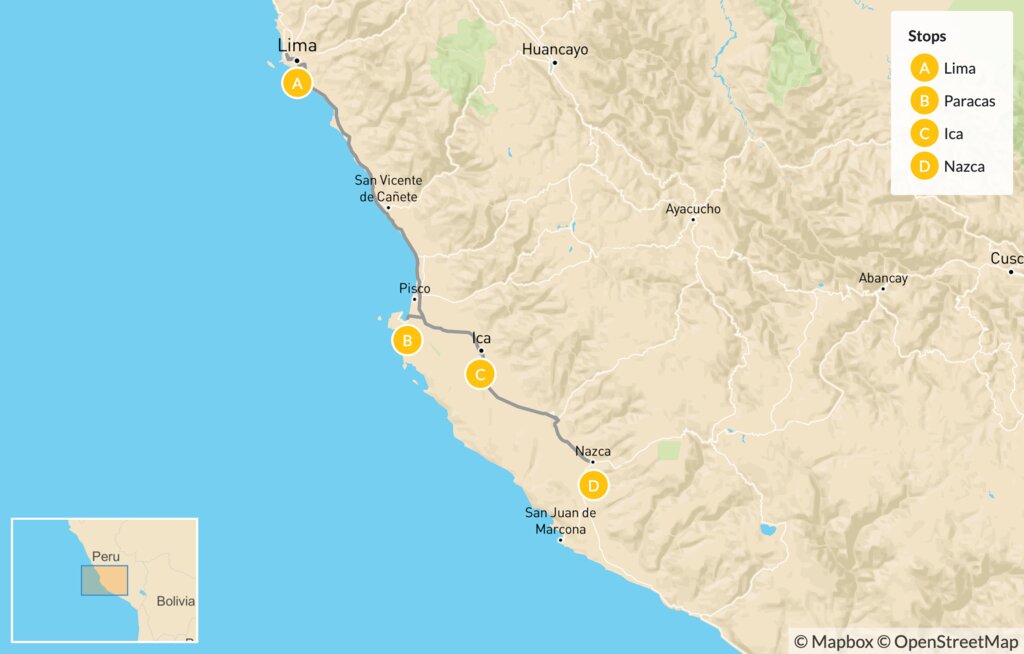 Map of Peru’s Luxurious Coastal, Desert & Vineyard Tour – 7 Days