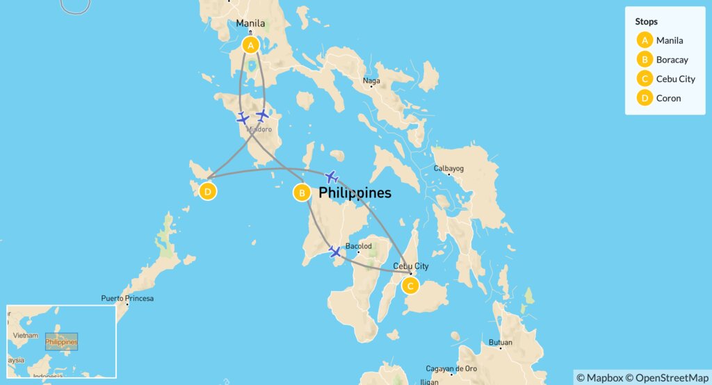 Map of Philippines Beaches & Nightlife: Manila, Boracay, Cebu & Coron – 14 Days