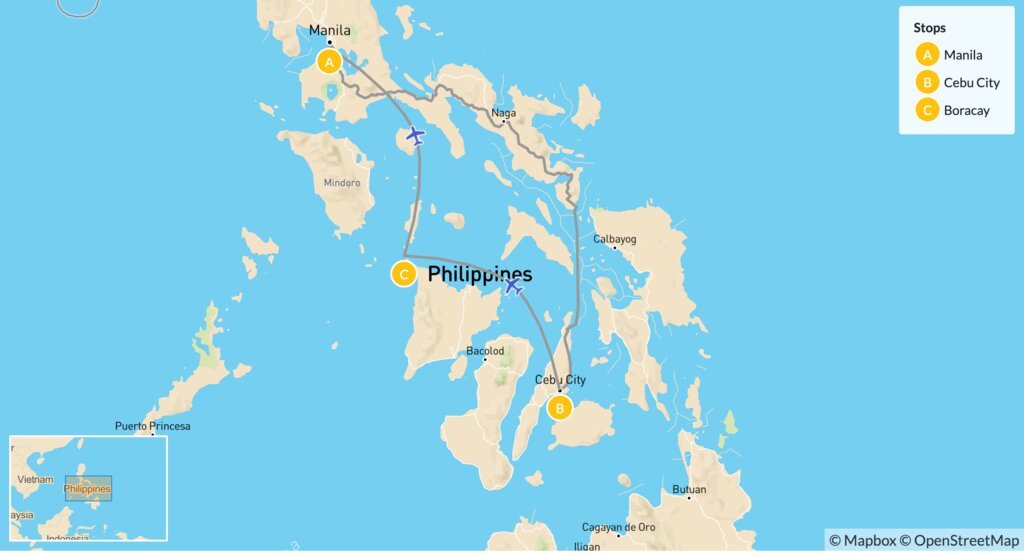 Map of Philippines Cities, Mountains & Beaches Tour: Manila, Cebu & Boracay -10 Days