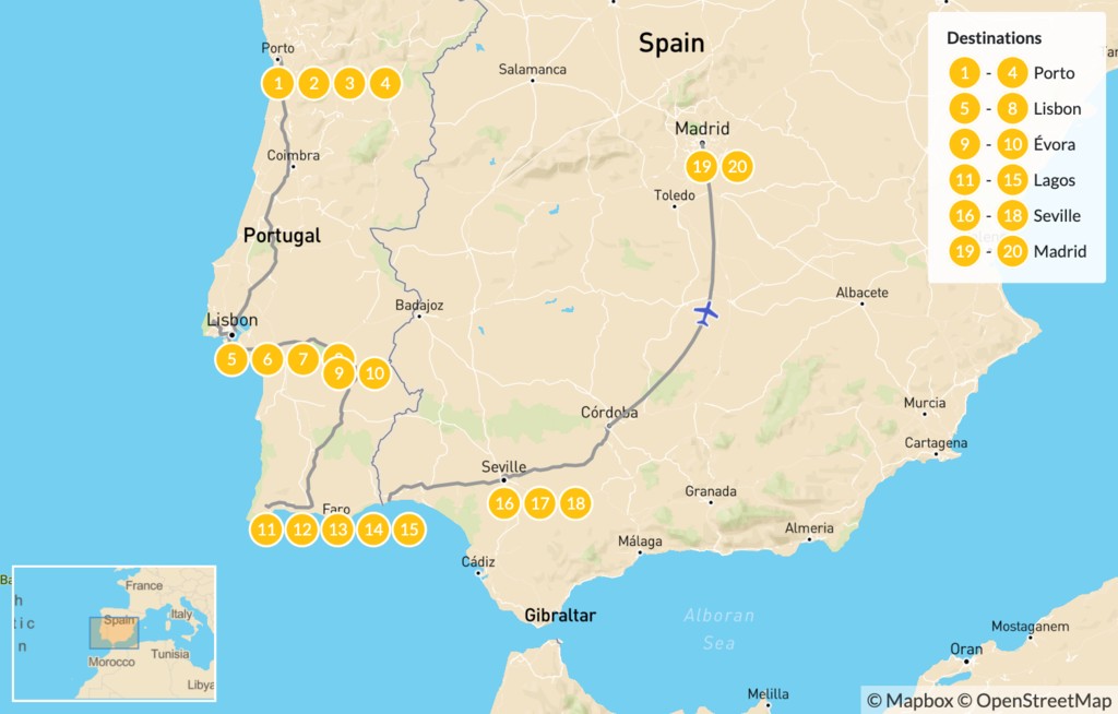 Map of Porto, Lisbon, the Algarve & Sevilla – 21 Days