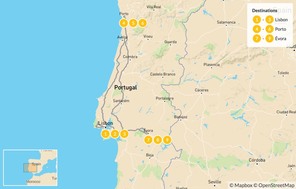 Map of Portugal Relaxed Self-Drive: Lisbon, Porto, Évora – 10 Days