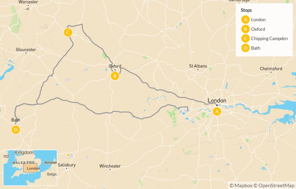 Map of Refined Trip Through Southern England: London, Oxford, the Cotswolds & Bath – 8 Days