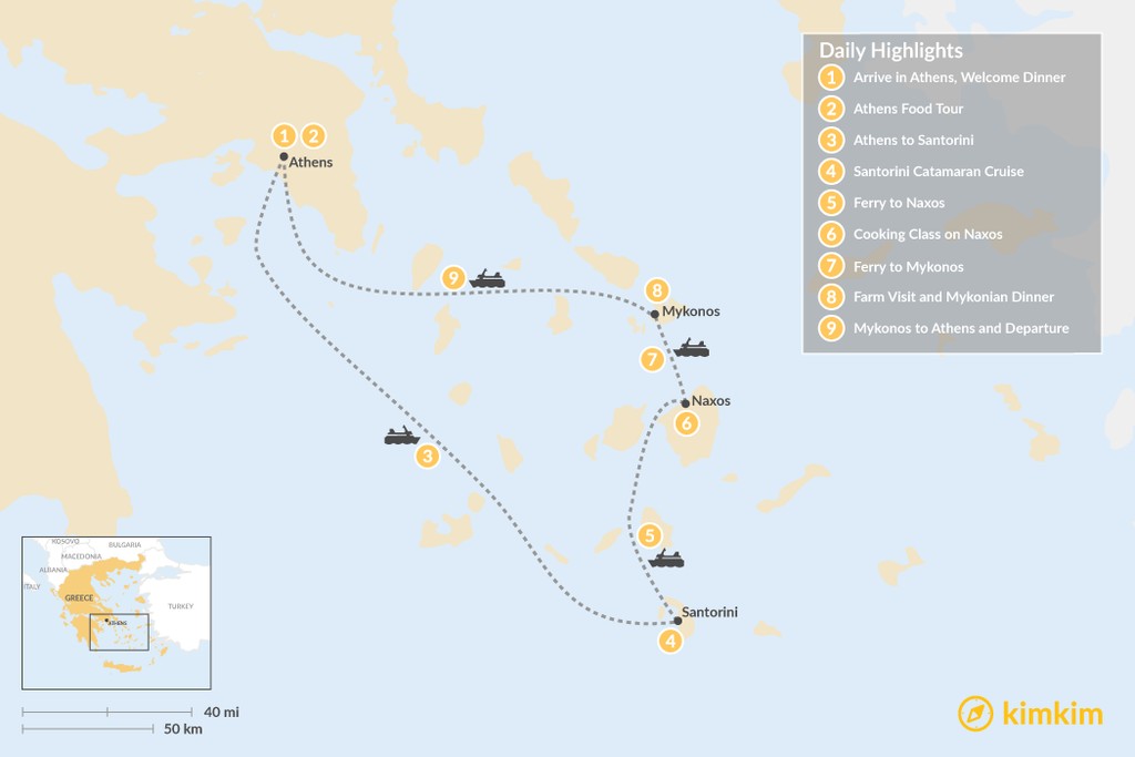 Map of Relaxed Athens, Santorini, Naxos & Mykonos – 9 Days