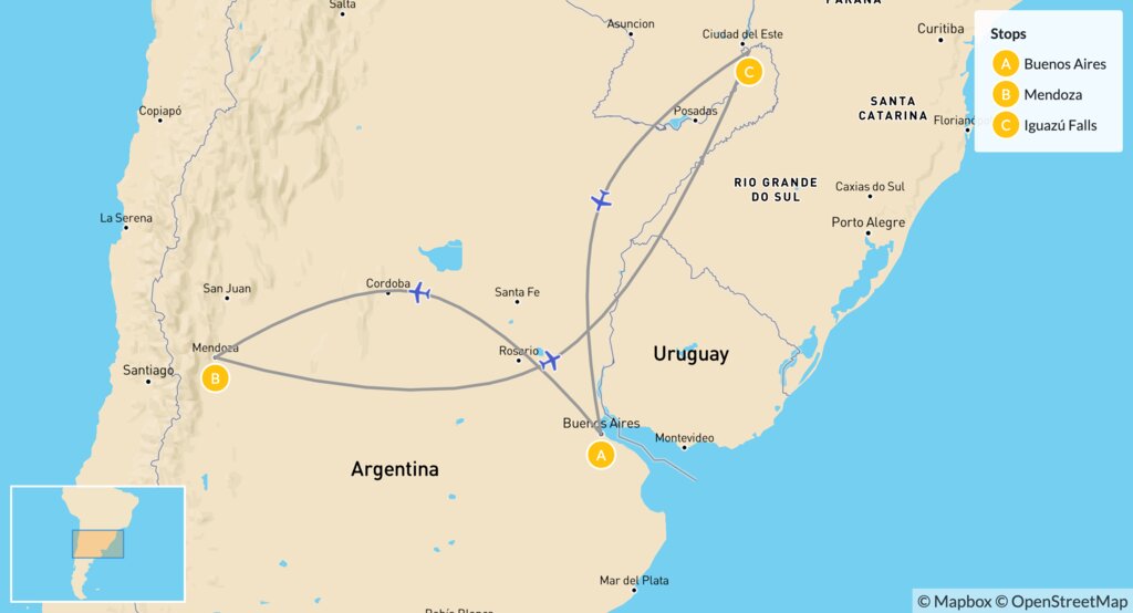 Map of Relaxed Buenos Aires, Mendoza & Iguazú Falls – 8 Days