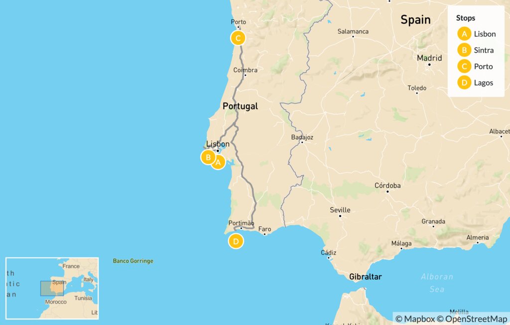 Map of Relaxed Portugal: Lisbon, Sintra, Porto & Lagos – 9 Days