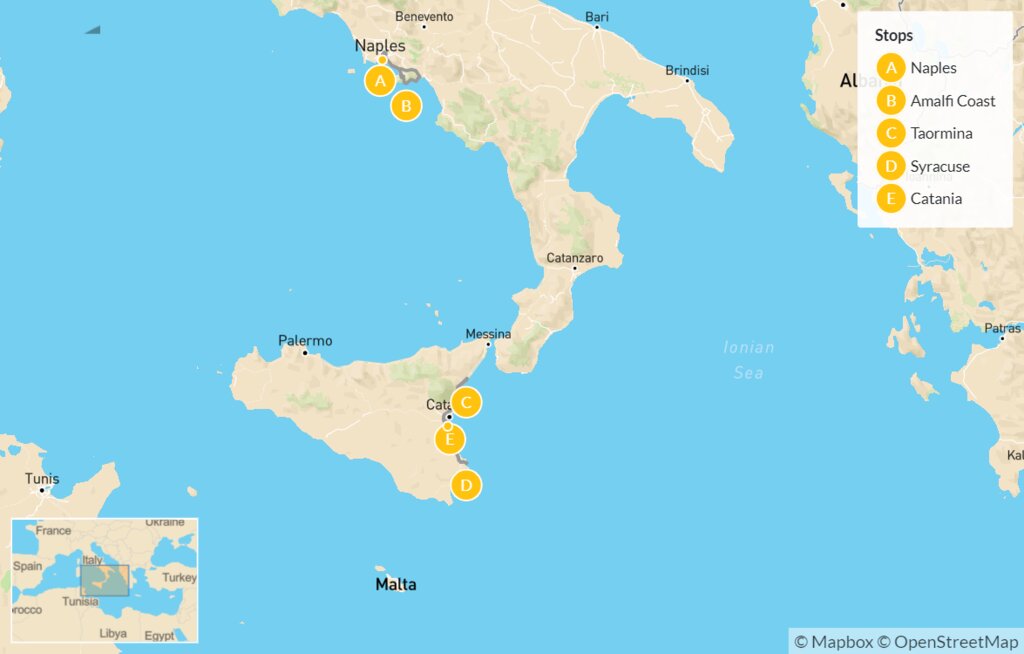 Map of Relaxed Sicily & Amalfi Coast Honeymoon – 10 Days