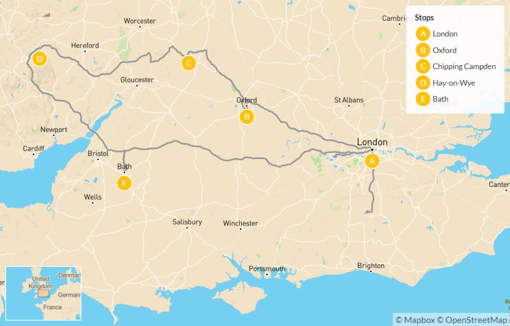 Map of Relaxed Southern England Road Trip: London to Bath via the Cotswolds & Welsh Borders – 12 Days