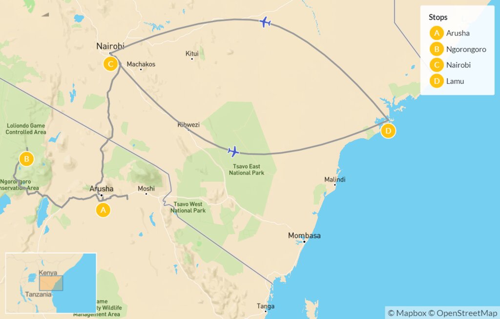 Map of Relaxed Tanzania & Kenya Adventure: Culture, Wildlife & Beaches- 10 Days
