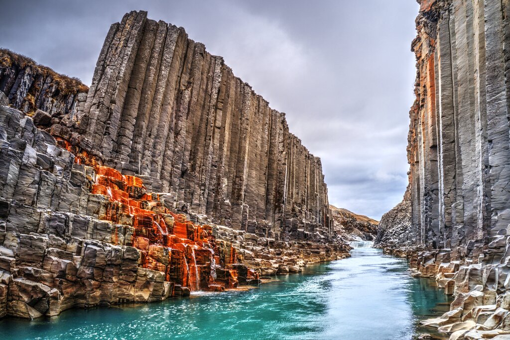 Your next stop is the secluded valley of Laugavalladalur, nestled in the Highlands and home to a small hidden geothermal stream that flows into a delightful warm waterfall and pool at the bottom. It’s the perfect spot to enjoy a relaxing soak before hopping back in the car and heading to the dramatic canyons of Hafrahvammagljúfur and Stuðlagil. The latter, in particular, is a photographer’s dream and possesses Iceland’s largest basalt rock columns, which provide a mesmerizing contrast to the blue-green glacial river below.