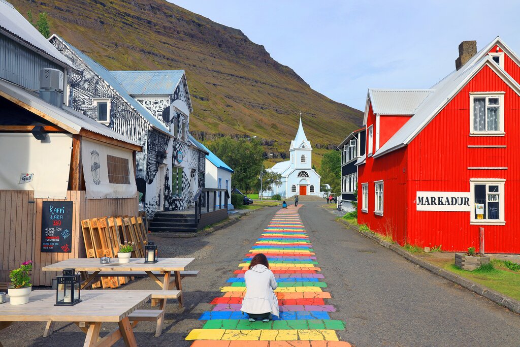 Arrive in Seyðisfjörður and check into your accommodation at Langahlid Cottages & Hot Tubs. Each self-catering cottage is comfortably furnished and well equipped, with three bedrooms and, of course, a hot tub to relax and star gaze in. The views, in particular, are mesmerizing, with sweeping views from the town center to the end of the fjord. Once you’ve settled in, spend the rest of the day exploring the town’s sculptures, artwork, and local galleries before settling on a cozy spot for dinner.