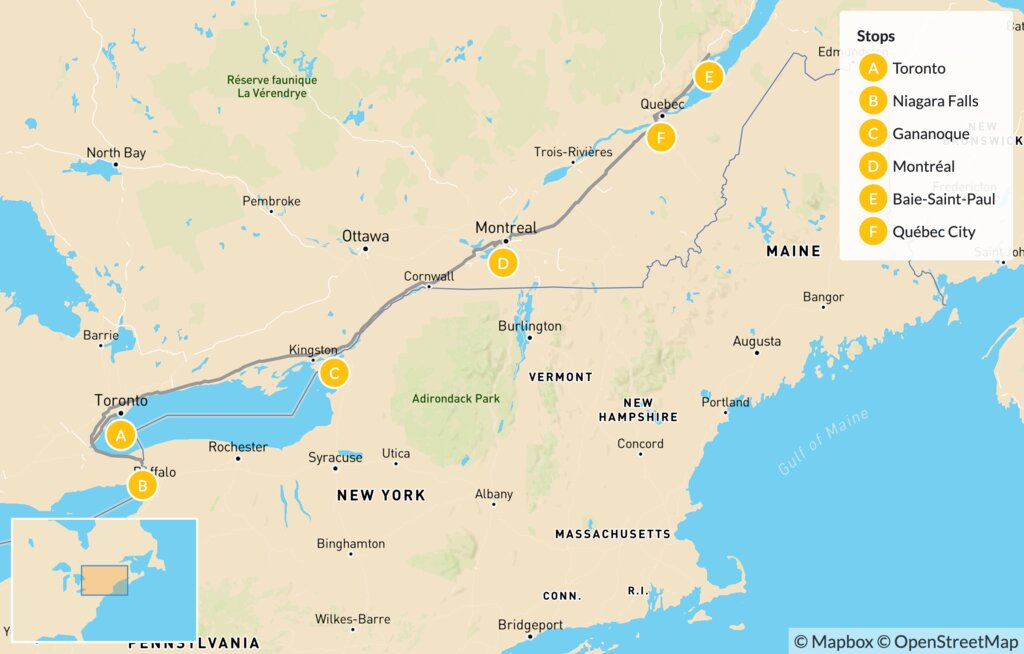 Map of Road Trip Across Ontario & Québec: From Niagara Falls to Baie-Saint-Paul – 11 Days
