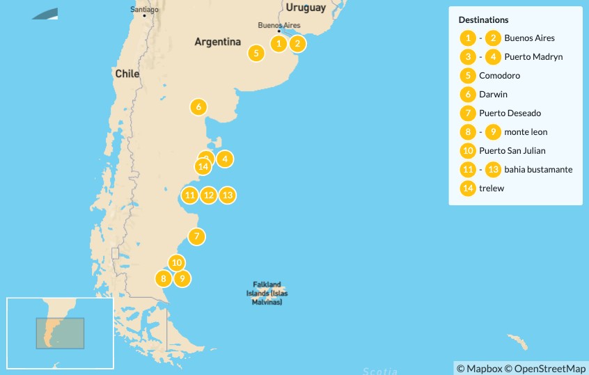 Map of Road Trip Along Argentine Patagonia’s Atlantic Coast – 14 Days