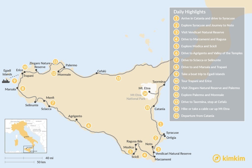 Map of Road Trip Around the Scenic Sicilian Coast – 15 Days