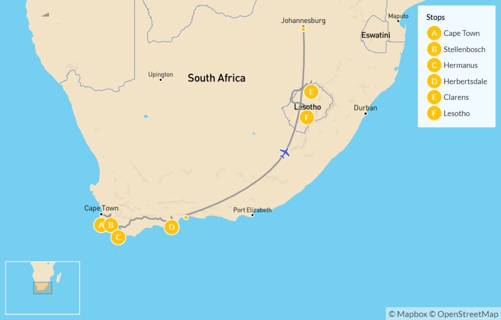 Map of Road Trip Through South Africa & Lesotho: Iconic Cities & Natural Landscapes – 14 Days