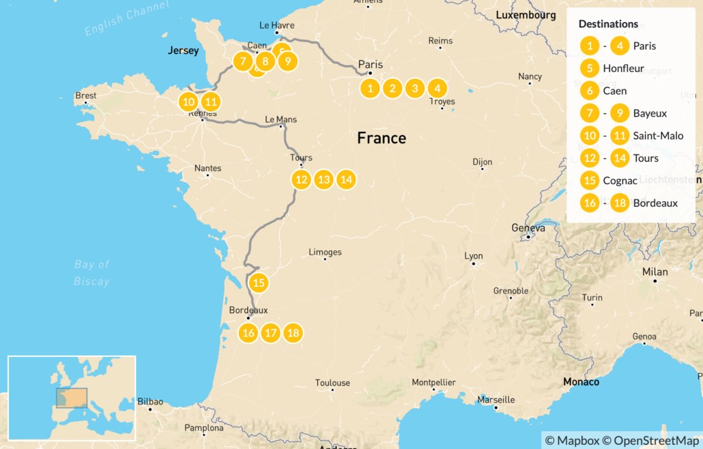 Map of Road Trip Through Western France: Paris, Normandy, Brittany, Cognac, Bordeaux, & More – 19 Days