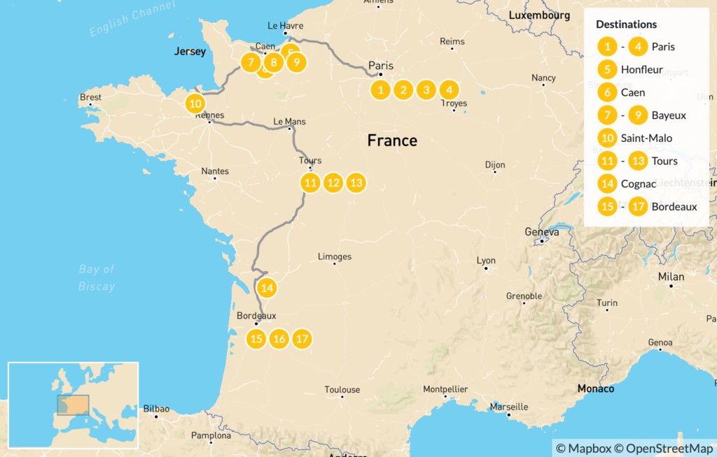 Map of Road Trip Through Western France: Paris, Normandy, Brittany, Loire Valley, Bordeaux, & More – 18 Days
