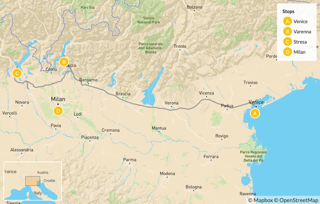 Map of Romance in the Italian Lakes: Venice, Lake Como & Lake Maggiore – 7 Days