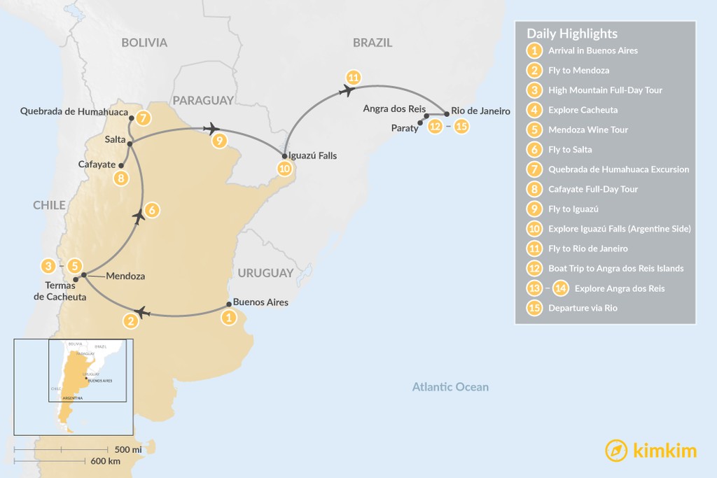 Map of Romantic Honeymoon in Argentina & Brazil – 15 Days