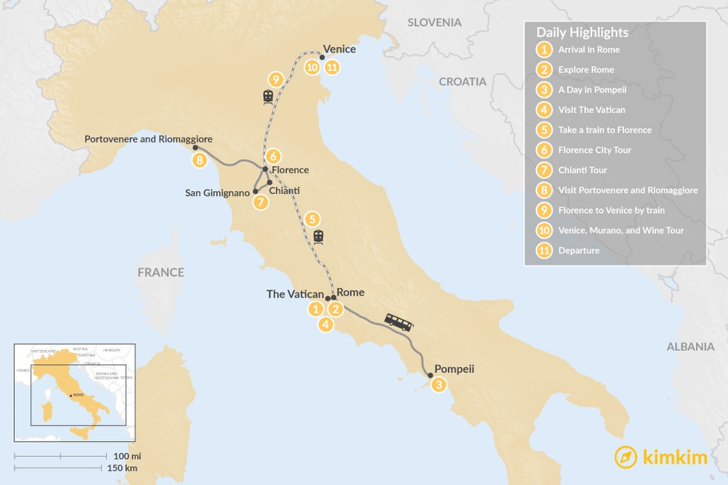 Map of Romantic Italy: Rome, Florence & Venice by Train – 10 Days