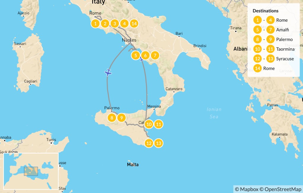 Map of Rome, Amalfi Coast, & Sicily – 15 Days