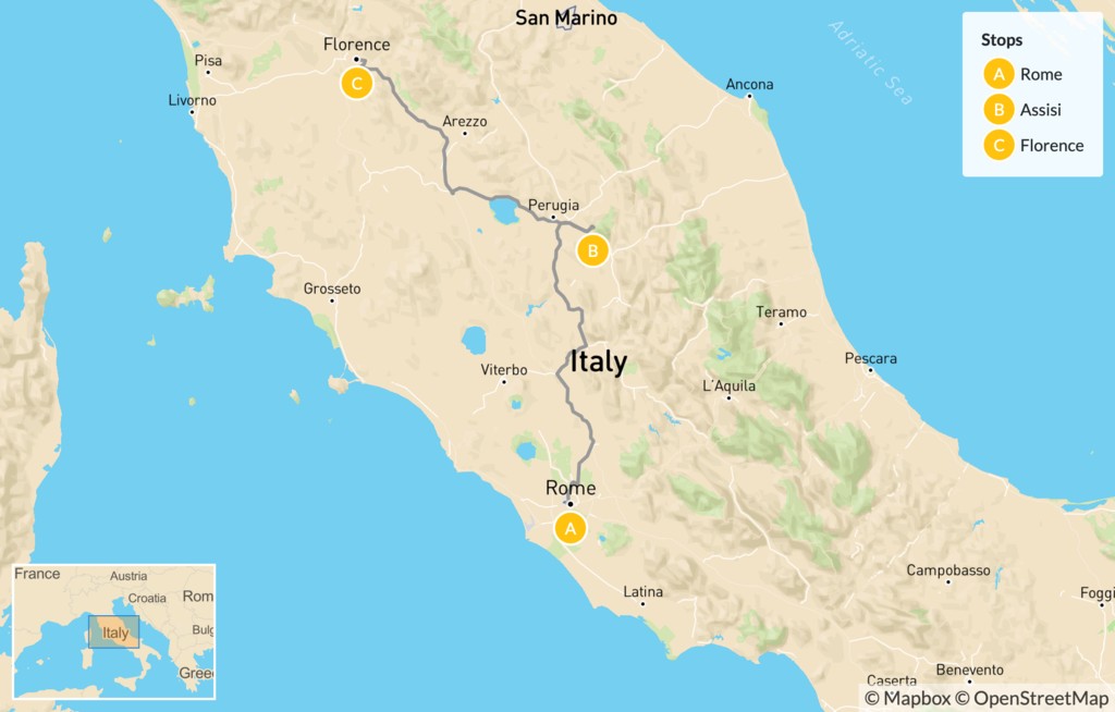 Map of Rome, Assisi & Florence – 9 Days