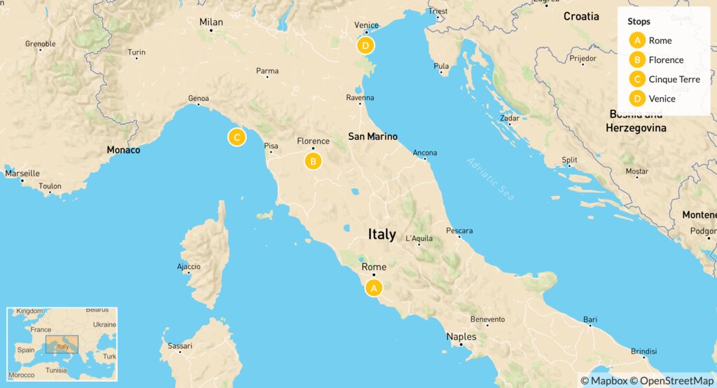 Map of Rome, Florence, Cinque Terre & Venice – 11 Days