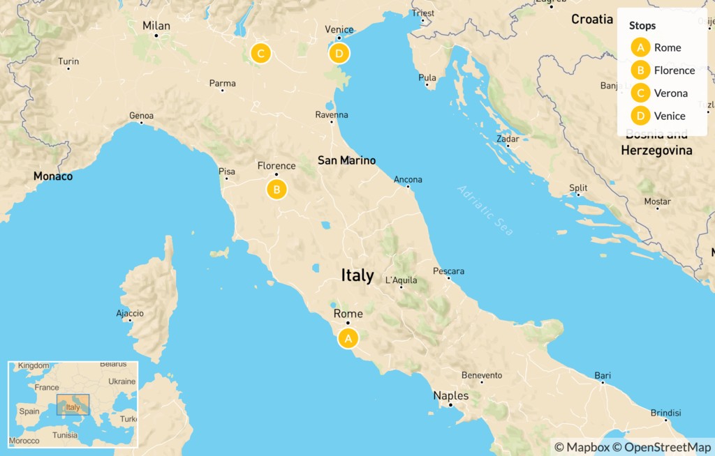 Map of Rome, Florence, Verona & Venice – 11 Days