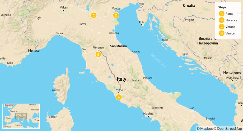 Map of Rome, Florence, Verona & Venice – 14 Days