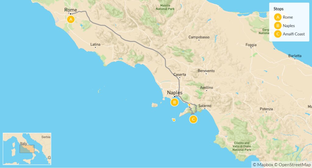 Map of Rome, Naples & the Amalfi Coast – 7 Days