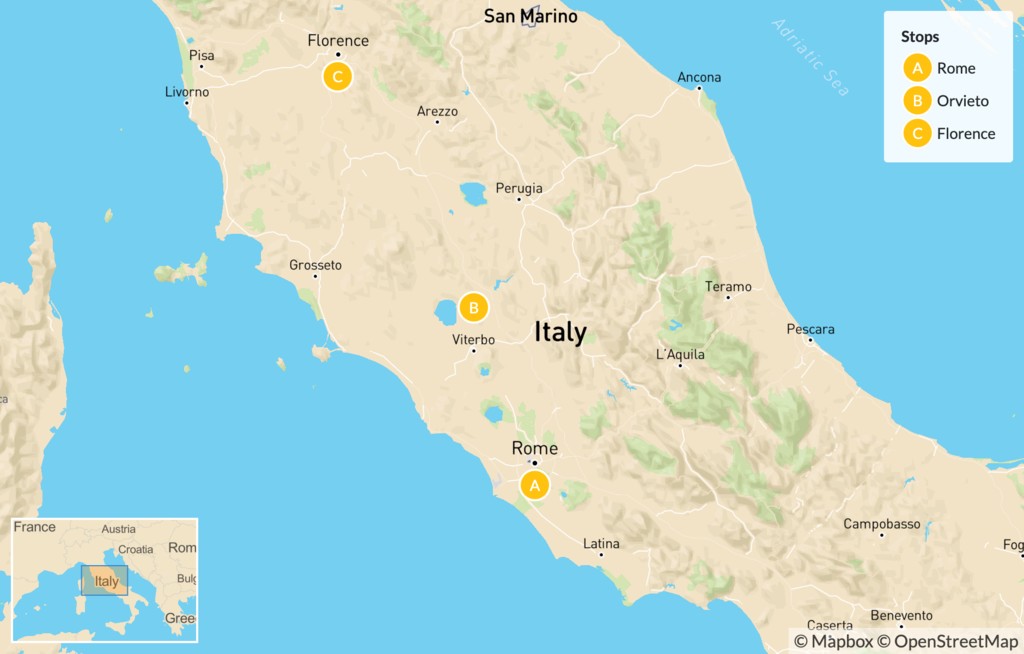 Spend your last few hours taking advantage of any last activities in Rome before you venture north to Orvieto. This medieval hill town is located in the lesser-explored Umbria region of central Italy, which is easily accessible from both Rome and Florence by frequent trains. The small city is home to a stunning cathedral as well as a network of underground caves built by the Etruscans.