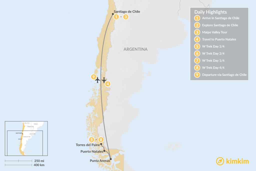 Map of Santiago & Modified W Trek Adventure – 9 Days
