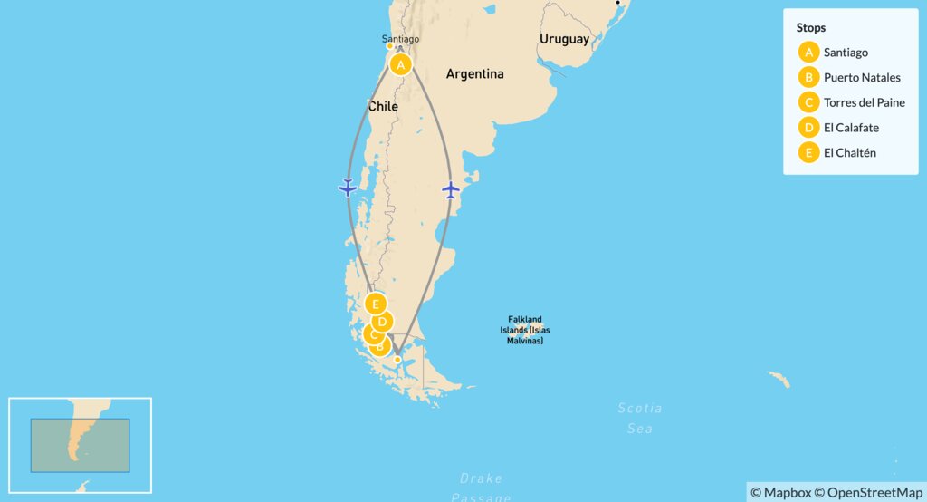 It’s time to say goodbye to Torres del Paine and Chile. In the morning, you’ll transfer from Puerto Natales to the Punta Arenas airport. There you’ll take a domestic flight to Santiago and catch your connecting flight back home. ¡Buen viaje!