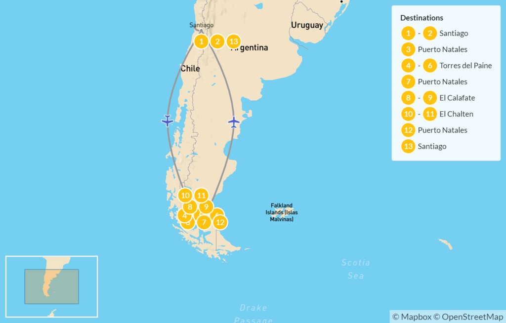 Map of Santiago & Patagonia: From Chile to Argentina – 13 Days