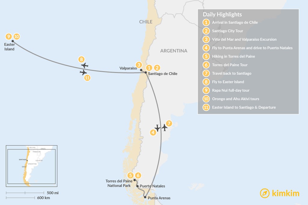 Map of Santiago, Torres del Paine & Easter Island – 11 Days
