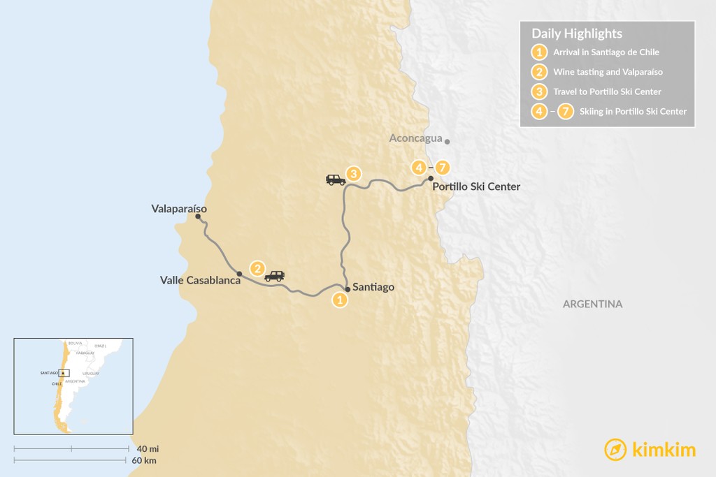 Map of Santiago, Valparaíso & Skiing in Portillo – 7 Days
