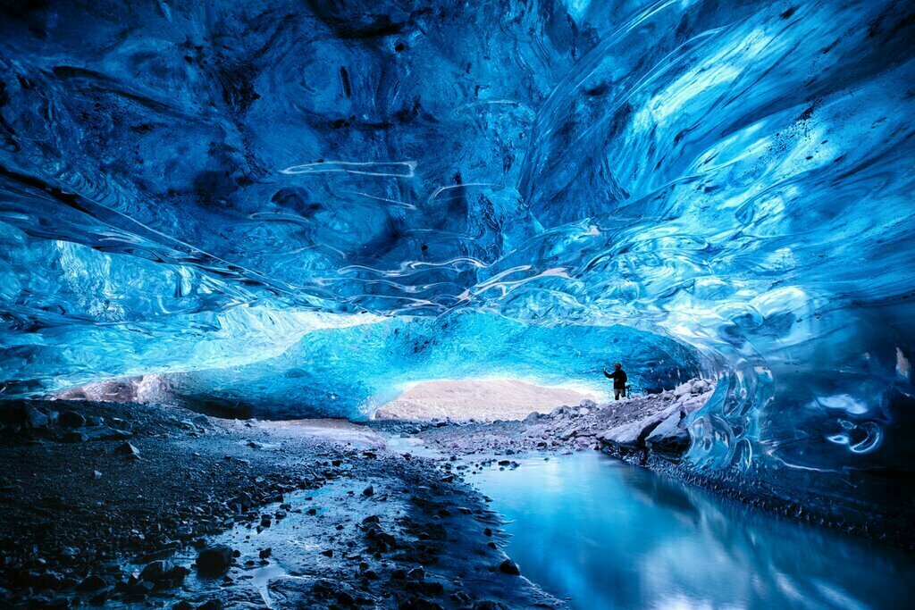 Today, you’ll immerse yourself (literally) in the wonders of this region’s Katla Geopark, the first such designated area in Iceland and a UNESCO World Heritage Site. In the morning, drive to the geopark and the Kötlujökull glacier, an outlet of the Mýrdalsjökull glacier. There, you’ll meet an expert guide, receive your equipment, and go over safety protocols. Then, together, you’ll enter the cave and, over the course of 2-3 hours, explore shimmering walls and vast chasms of ice.