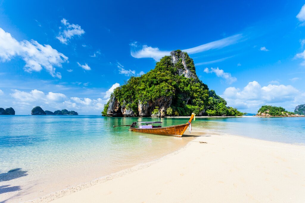 Early this morning, a driver will pick you up from your hotel for a short ride to the pier at Nopparat Thara Beach. Here, you’ll begin your full-day island-hopping tour. It starts when you board a boat to Tup Island, which is really two small islets connected by sandbars. When you arrive at low tide, it will be possible to walk between the two. Then, continue to adjacent Ko Kai (Chicken Island), a rocky isle shaped like a chicken head fringed with white-sand beaches.