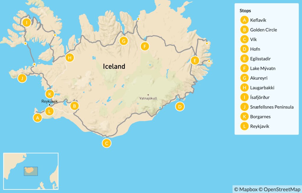Map of Self-Drive Highlights of Iceland’s Ring Road – 16 Days