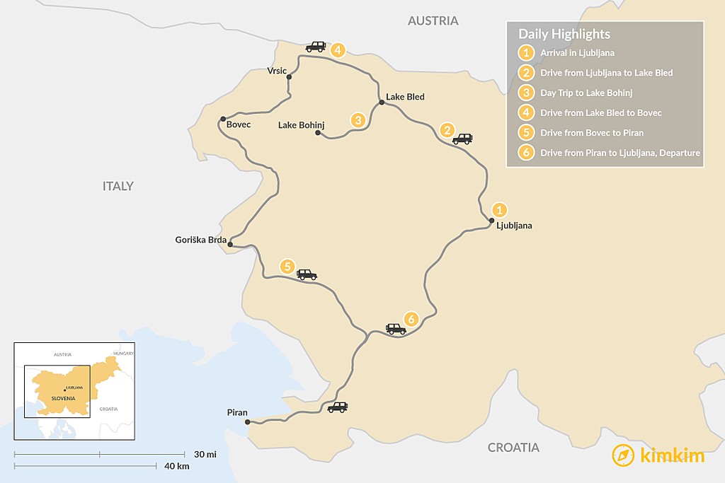 Map of Self-Drive Highlights of Slovenia – 6 Days