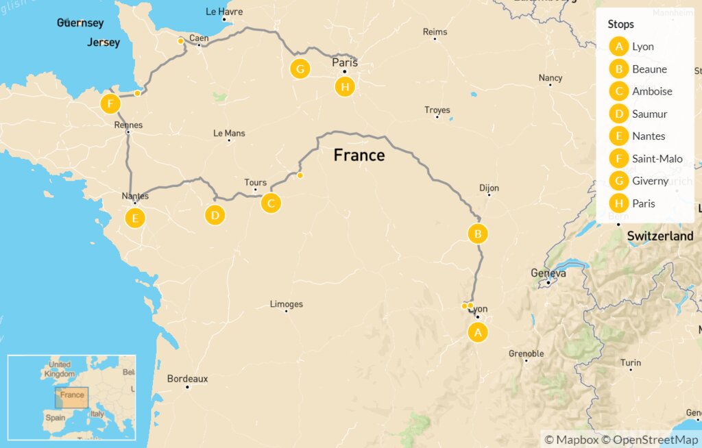 Map of Self-Drive Journey Through Burgundy, the Loire Valley & Brittany – 11 Days