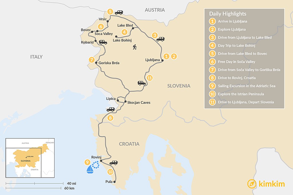 Map of Self-Drive Slovenia & Croatia: Ljubljana to Rovinj – 11 Days