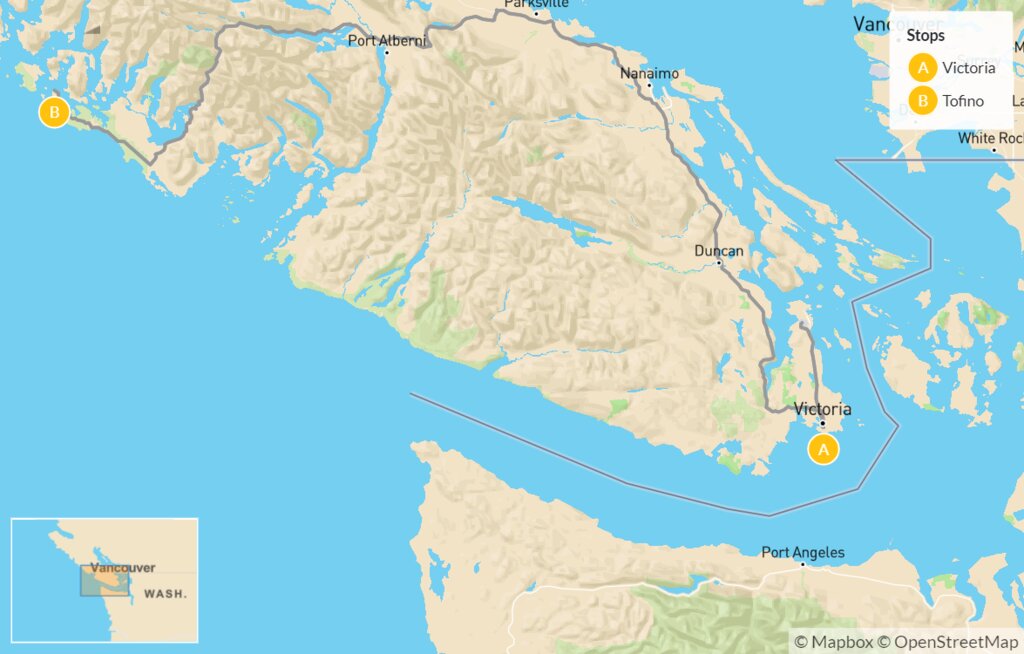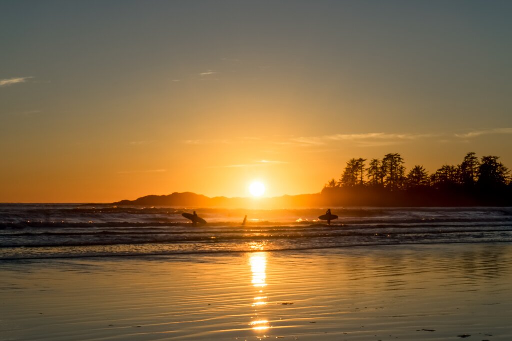 Say goodbye to Victoria for now as you hit the road for a four-hour drive to Tofino, a small town on the west coast. Drive along the tranquil Strait of Georgia until you reach Duncan, known as the “City of Totems” for the 80 or so totem poles scattered throughout the town by the Coast Salish people. Admire the intricate carvings, each telling unique stories, and learn about their cultural significance. Back in the car, make another stop in the coastal city of Port Alberni to stretch your legs on a short hike or grab a bite to eat.