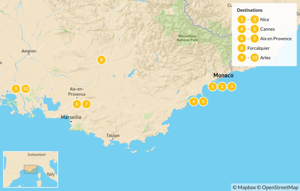 Discover the best of the culture and art in the French Riviera and Provence in 10 days on this incredible self-drive tour. Visit vibrant Nice and Monaco, stroll through hill-top villages of Luberon, and discover the peaceful countryside of Aix-en-Provence. Follow the footsteps of some of the world’s greatest artists (Van Gogh, Picasso & others) and explore the landscapes that inspired them.